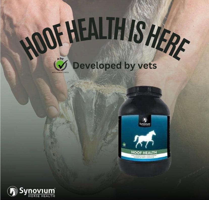 Synovium® Hoof Health is a dietary supplement specially formulated by our vets to support the horses hooves. The supplement contains the ingredients Biotin, Zinc and Copper to support the growth, quality and hardness of the hooves.