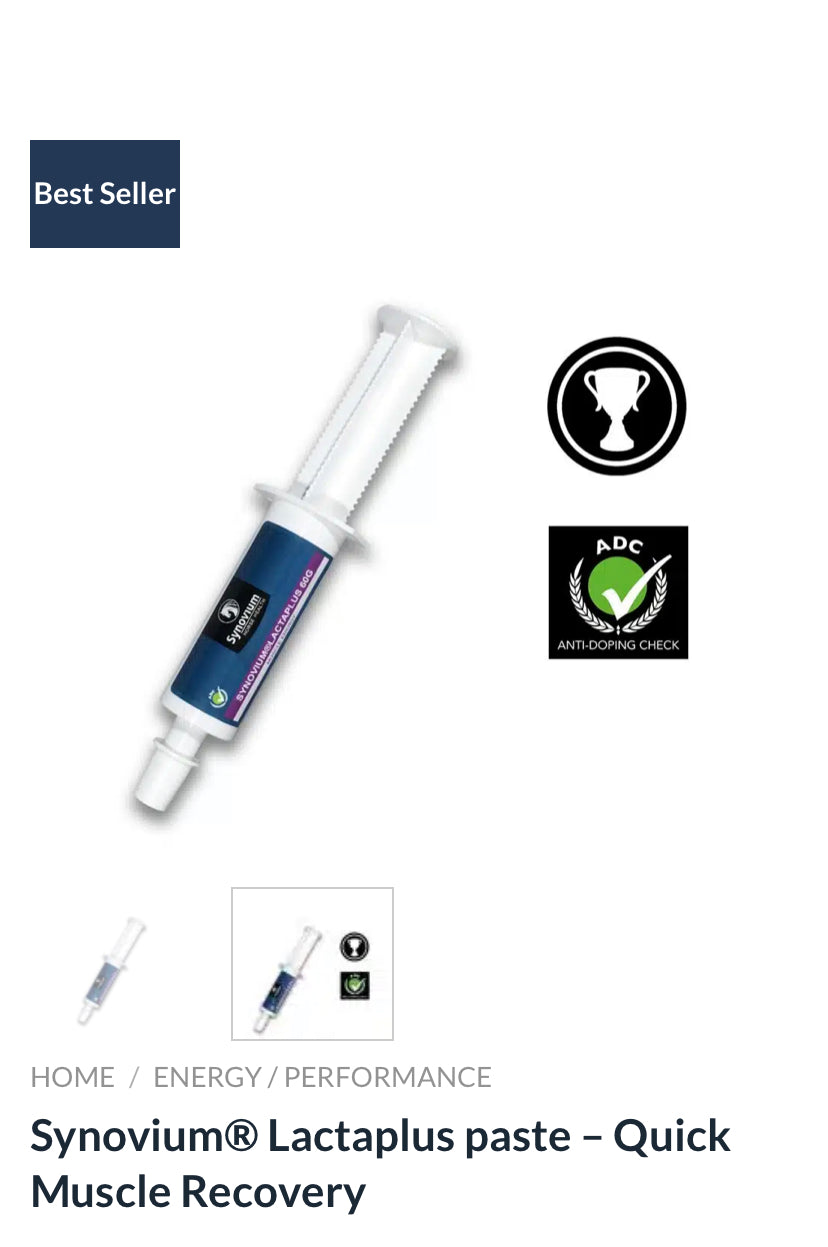 Synovium® Lactaplus Paste provides horse muscle recovery when most needed. It is suitable for horses undergoing intense physical exertion. Designed to help protect against lactic acid build up and speed up recovery. Contains L-Carnitine an essential cofactor in muscle metabolism and muscle energy.
